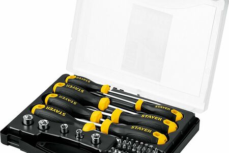 Специально разработанная двухкомпонентная рукоятка и магнитный наконечник значительно повышают комфорт при работе- Количество предметов: 46 шт- Материал стержня: Cr- V - Кейс: да - Диэлектрическое покрытие: нет - Намагниченный наконечник: да