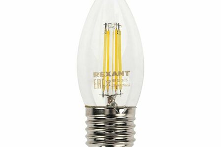 Филаментная прозрачная лампа REXANT CN35 в форме свечи мощностью 7.5Вт с цоколем E27 и с белым свечением в 4000K прекрасно подходит для дизайнерского освещения комнат, домов, гостиниц, кафе, и других объектов.