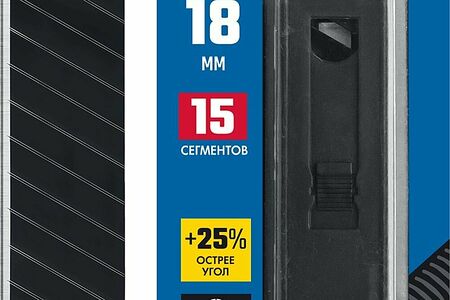 Максимально острые вороненые лезвия с более острым углом заточки.- Ширина лезвия: 18 мм- Материал лезвия: У8А - Тип покрытия: Вороненые - Тип лезвия: Сегментированное - Количество лезвий в упаковке: 10 шт- Количество сегментов: 15