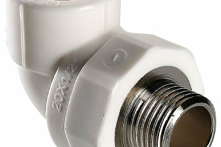 Двухсторонний металлопластиковый фитинг для соединения под углом 90 градусов друг к другу полипропиленового трубопровода и компонента инженерной системы с резьбовым подключением, 20 х 1/2". Резьба фитинга - наружная трубная, по ГОСТу 6357.