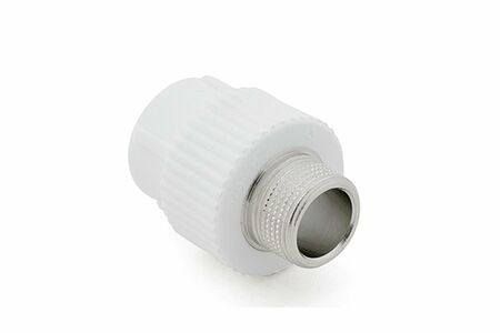 Муфта комбинированная наружная резьба. Служит для перехода на резьбовое трубное соединение. Представляет собой комбинированное изделие из полипропиленового фитинга внутри которого установлена никелированная латунная закладная, круглого сечения с поперечными проточками и торцевыми выступами увеличивающими поверхность сцепления с полипропиленом. Конструкция обеспечивает надежную фиксацию закладной детали в осевом и радиальном направлении, что гарантирует герметичность фитинга во всем диапазоне рабочих температур. Материал корпуса выполнен из PPR 80 (PPR100). Материал закладной детали латунь никелированная ЛС 59-2. Закладная выполнена методом горячего прессованная с последующей механической обработкой. Резьба дюймовая, трубная цилиндрическая по ГОСТ 6357-81. Номинальное давление PN25. Максимальная рабочая температура 95 градС. Цвет серый или белый. Монтаж ПП части фитинга выполняется методом термической диффузионной раструбной сваркой. Форма поставки - в коробках из гофракартона, промежуточная упаковка полиэтиленовые пакеты с кратным числом фитингов.