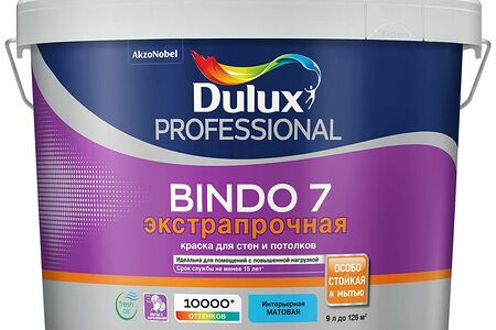 Латексная интерьерная краска Dulux Bindo 7 - экстрапрочное матовое водно-дисперсионное покрытие для стен и потолков. Наносится на кирпич, штукатурку, бетон, обои, гипсокартон и другие основания. Подходит для отделки больших помещений с высокой проходимостью.