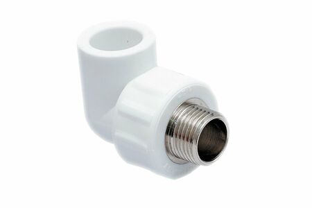 Угольник 90 град комбинированный наружная резьба. Предназначен для соединения напорных полипропиленовых и стальных труб под углом 90 град друг к другу в системах холодного, горячего водоснабжения и отопления. Представляет собой комбинированное изделие из полипропиленового фитинга внутри которого установлена никелированная латунная закладная, круглого сечения с поперечными проточками и торцевыми выступами увеличивающими поверхность сцепления с полипропиленом. Конструкция обеспечивает надежную фиксацию закладной детали в осевом и радиальном направлении, что гарантирует герметичность фитинга во всем диапазоне рабочих температур. Материал корпуса выполнен из PPR 80 (PPR100). Материал закладной детали латунь никелированная ЛС 59-2. Закладная выполнена методом горячего прессованная с последующей механической обработкой. Резьба дюймовая, трубная цилиндрическая по ГОСТ 6357-81. Номинальное давление PN25. Максимальная рабочая температура 95 градС. Цвет серый или белый. Монтаж ПП части фитинга выполняется методом термической диффузионной раструбной сваркой. Форма поставки - в коробках из гофракартона, промежуточная упаковка полиэтиленовые пакеты с кратным числом фитингов.