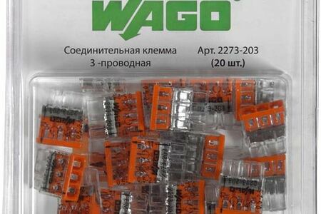 "Электромонтажные клеммы Wago с самозажимным механизмом - готовое решение для быстрого соединения между собой трех проводов диаметром 0,5-2,5 кв.мм. Изделия подходят для монтажа проводов из алюминия или меди, как одножильных, так и многожильных. Жила кабеля вставляется в клемму и самозажимной контакт прочно фиксирует данное соединение. Устройство отличается надежностью и безопасностью. Клемма соединительная облегчает и ускоряет монтаж при устройстве электропроводки, подключении фурнитуры и осветительных приборов. Предназначена для соединения проводов и кабельных жил из алюминия и меди. Возможность одновременного подключения проводников различного сечения (от 0,5 до 2,5 кв.мм), номинальный ток до 24 А и понятная цветовая маркировка для быстрого доступа. Прозрачный корпус позволяет визуально контролировать правильность монтажа. Вы можете использовать прозрачный порт для проверки правильности зачистки изоляции с целью обеспечения защиты от случайного контакта. Тестовые разъёмы оптимизированы для всех стандартных измерительных щупов. Особенности: каждый проводник имеет отдельное клеммное место и не повреждается в процессе монтажа, уникальная цветовая маркировка каждого типоразмера клемм, конструкция клемм предусматривает возможность монтажа проводов различных сечений от 0,5 до 2,5 кв.мм в одной клемме, прозрачный корпус позволяет контролировать глубину захода жилы, на каждой клемме нанесена разметка длины зачистки проводников, конструкция корпуса клемм предусматривает тестовые гнезда, оптимизированные под все стандарты измерительных щупов, гарантированная надежность контактов, исключающая короткое замыкание и разогрев в точке соединения, монтаж не требует использования инструментов"