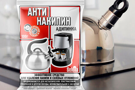 Средство для удаления накипи Антинакипин сухой универсальное. Эффективное средство для удаления накипи. Предназначается для металлической, пластмассовой, стеклянной и другой посуды, нечувствительной к кислотам. Новая формула с адипиновой кислотой увеличивает срок службы водонагревательных приборов, экономит электроэнергию.