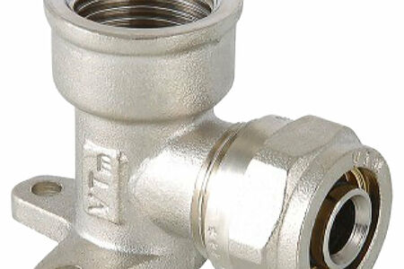 Угловой латунный никелированный фитинг с креплением (водорозетка) для соединения металлополимерного трубопровода с компонентом системы, имеющим резьбовое подключение. Резьба фитинга - внутренняя трубная по ГОСТу 6357, 20 х 3/4"