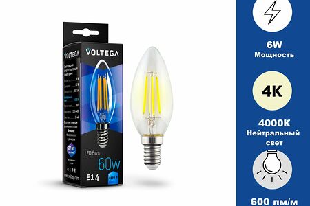 Лампа светодиодная свеча. Candle ( transparent ). Ватность 6 W. Цоколь Е14 . Цветовая температура 4000К