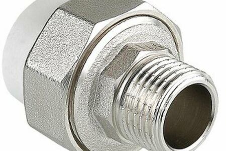 Полипропиленовый фитинг для создания разъемного, с использованием накидной гайки, соединения полипропиленового трубопровода с трубопроводом или арматурой из других материалов. Уплотнительное кольцо выполнено из синтетического каучука EPDM. Резьба фитинга – наружная трубная по ГОСТу 6357.