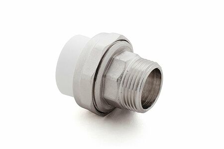 Муфта комбинированная разъёмная наружная резьба. Служит для создания быстроразъёмного соединения стальных и полипропиленовых труб в единой системе. Представляет собой комбинированное изделие выполненное из полипропиленового фитинга и металлической части с наружной резьбой соединенных накидной гайкой. Между частями установлено уплотнительное кольцо. На металлическом корпусе предусмотрен участок под гаечный ключ. Основной задачей этой арматуры является создание быстроразъемного соединения с помощью которого можно оперативно провести монтаж/демонтаж частей системы. Материал полипропиленового корпуса выполнен из PPR 80 (PPR100). Материал металлической детали латунь никелированная ЛС 59-2. Металлическая часть выполнена методом горячего прессованная с последующей механической обработкой. Резьба дюймовая, трубная цилиндрическая по ГОСТ 6357-81. Уплотнительное кольцо EPDM. Номинальное давление PN25. Максимальная рабочая температура 95 градС. Цвет серый или белый. Монтаж ПП части фитинга выполняется методом термической диффузионной раструбной сваркой. Форма поставки - в коробках из гофракартона, промежуточная упаковка полиэтиленовые пакеты с кратным числом фитингов.