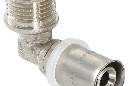 Угловой пресс - фитинг для подсоединения к металлопластиковым трубам (металлополимерные трубы) компонента системы с резьбовым подключением, 16 х 1/2"Резьба фитинга - наружная трубная, по ГОСТу 6357. Cерия VTm.253.N
