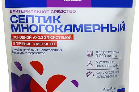 Септик многокамерный. Устраняет неприятный запах, разлагает органику, фекалии, жиры, бумагу, крахмал, мочевину, белок. Существенно снижает необходимость авто-ассинезации. Создан Российскими учеными на основе микроорганизмов постоянно присутствующих в почвах России.Содержит высокую концентрацию (2Х10⁹ КОЕ) 5 видов спор анаэробных и аэробных бактерий. Композиция бактерий подобрана с учетом особенностей эксплуатации многокамерных септиков: ограниченный или отсутствующий доступ кислорода во всей толще обслуживаемой массы, большой объем твердых и иловых отложений. Препарат нетоксичен для человека, животных, растений.
