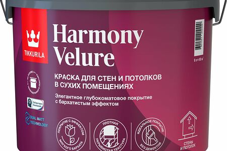 Краска с бархатистым эффектом интерьерная глубокоматовая. Предназначена для окраски новых и ранее окрашенных оштукатуренных, бетонных, зашпатлеванных, кирпичных, деревянных и гипсокартонных поверхностей, а также древесностружечных и древесноволокнистых плит внутри помещений, в т.ч. в детских дошкольных, учебных, лечебно-профилактических учреждениях и других помещениях с предусмотренным режимом влажной дезинфекции. Не подходит для окраски дверей и мебели. Применяется для окраски стен и потолков в сухих помещениях с умеренной эксплуатационной нагрузкой, например спальни, кабинеты и зоны отдыха.