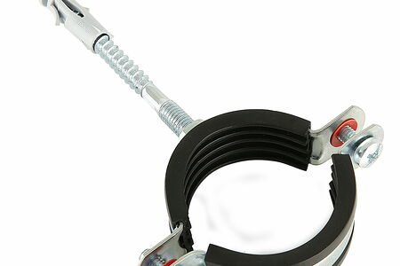 Стальной кронштейн используется в качестве неподвижной опоры при креплении к несущей поверхности труб из различных материалов и представляет собой снабженный резиновым уплотнением металлический хомут с гайкой, болтом и дюбелем.