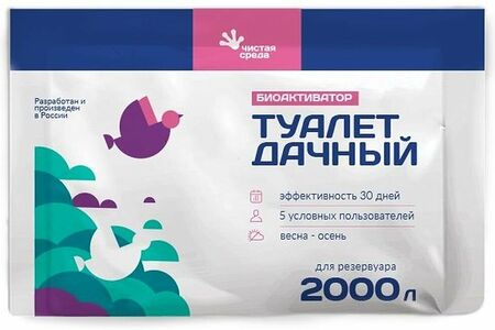Туалет дачный 2000 л.Устраняет неприятный запах, разлагает органику, фекалии, жиры, бумагу, крахмал, мочевину, белок. Создан российскими учеными на основе микроорганизмов постоянно присутствующих в почвах России. Содержит уникальную для российского рынка концентрацию (3Х10⁸ КОЕ) 4 видов спор аэробных и анаэробных бактерий. Средство нетоксично для человека, животных, растений.