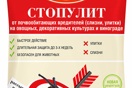 «Стопулит» — эффективный препарат от слизней и улиток на овощных, плодово-ягодных, декоративных культурах. Соприкосновение с гранулами ведет к поражению кожи и слизистых оболочек вредителей. Основное губительное действие препарата — это контактно-кишечное отравление улиток и слизней. Результаты работы средства заметны через 3–5 дней. Период химической активности гранул длительный, не требующий повторного рассева гранул препарата.