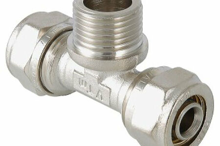 Трехсторонний латунный никелированный фитинг для подсоединения к металлопластиковому трубопроводу компонента с резьбовым подключением. Резьба фитинга - наружная трубная, 20 х 3/4", по ГОСТу 6357. Cерия VTm.333.N