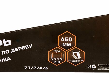 С помощью двухкомпонентной рукоятки обеспечивается надежный хват, и при длительной работе не натирает руки.длина рабочей части: 450 мм, тип заточки: трехгранная, шаг зуба: 7-8 TPI