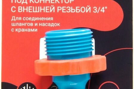 Предназначен для соединения шлангов и насадок с кранами, имеющими внутреннюю резьбу 3/4. Нескользящаяя поверхность.