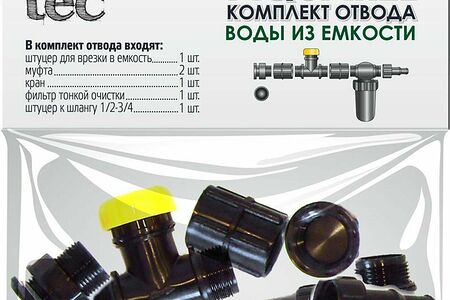 Комплект включает в себя несколько элементов: 1 штуцер для врезания в емкость, 2 муфты, 1 кран, 1 фильтр тонкой очистки воды, штуцеры к шлангу 1/2-3/4. Система отличается легкостью монтажа и установки, надежна и безопасна в эксплуатации.