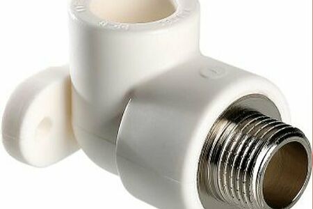Комбинированный угловой фитинг с креплением, предназначенный для подсоединения к полипропиленовому трубопроводу сантехнического смесителя или другого компонента инженерной системы с резьбовым подключением. Резьба фитинга - наружная трубная по ГОСТу