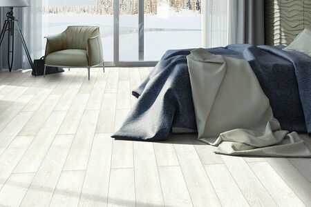 Узкие светлые доски с фактурой натуральной древесины способствуют оптическому увеличению пространства. Дубовый пол прекрасно сочетается с деревянной мебелью и натуральным текстилем. Белый ламинат с глубокой выразительной структурой и эффектом ручной обработки подходит для стилей минимализм, скандинавский, прованс и других современных направлений.