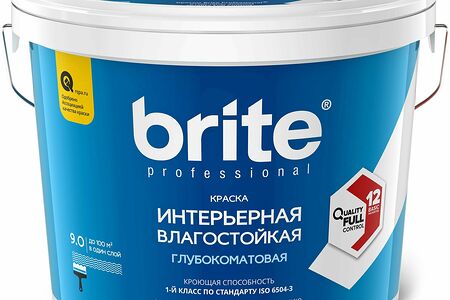 Профессиональная акриловая краска Brite Professional Quality Full Control интерьерная влагостойкая глубокоматовая. Рекомендована для отделки стен и потолков в помещениях, требующих влажной уборки с применением растворов синтетических моющих средств. Образует бархатистое покрытие, которое соответствует 1-му классу стойкости к влажному истиранию по стандарту ISO 11998.