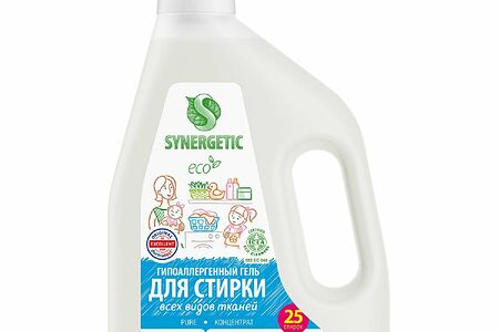 Концентрированный гель для стирки всех видов тканей SYNERGETIC PURE обеспечивает гигиеническую чистоту, устраняет неприятный запах и предотвращает его появление. Подходит для стирки цветного и белого белья из натуральных и синтетических тканей. Препятствует пожелтению ткани и общей потере цвета изделия. Комбинация энзимов и растительных ПАВ эффективно удаляет загрязнения и пятна с волокон ткани даже в холодной воде и при коротких циклах стирки. Функциональные добавки предотвращают повторное оседание загрязнений на ткани, сохраняя ее первоначальный вид, насыщенность цвета и прочность. Препятствуют возникновению катышков, делая волокна более гладкими. Инновационные растительные полимеры защищают одежду, предотвращая от проникновения загрязнений глубоко в волокна ткани. Эффективность подтверждена в Германии. Гель полностью выполаскивается из тканей, подходит для стирки детского белья 0+ и одежды людей с чувствительной кожей. Не содержит ароматизаторов и красителей. Дерматологически протестирован исследовательским институтом Dermatest в Германии. Биоразлагаемые компоненты не вредят микрофлоре септических установок.