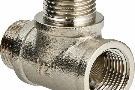 Латунный никелированный трехсторонний фитинг, равнопроходной. Резьба - внутренняя/наружная/наружная, 1/2", цилиндрическая трубная по ГОСТу 6357 (ISO 228, EN 10226). Внутренняя резьба совместима с наружной конической трубной резьбой по ГОСТу 6211 (ISO R7).