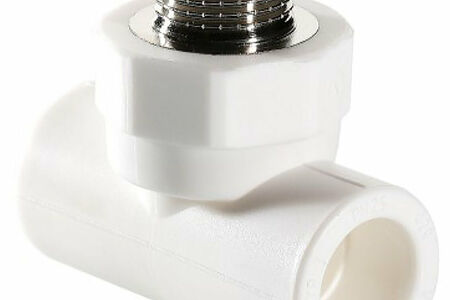 Трехсторонний металлопластиковый фитинг для подсоединения к полипропиленовому трубопроводу компонента инженерной системы с резьбовым подключением. Резьба фитинга - наружная трубная, 20 х 1/2", по ГОСТу 6357.