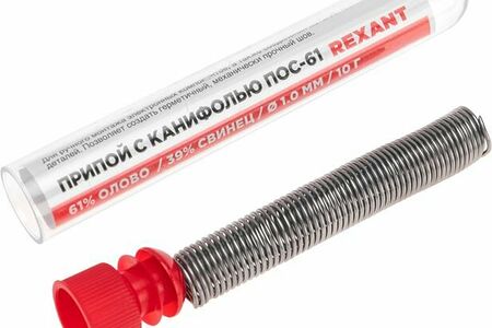 Припой с канифолью REXANT представляет собой проволоку (диаметром 1 мм) из сплава олова (61 %) и свинца (39 %). Используется в пайке для соединения деталей между собой и позволяет создать герметичный, механически прочный (устойчивый) шов. Нагреваясь до температуры плавления (183...188 °С) припой: расплавляется, смачивает спаиваемый металл и, растекаясь по нему — заполняет место между соединяемыми деталями.В свою очередь флюс канифольный активный (MC-20A) помогает сделать паянное соединение более прочным!
