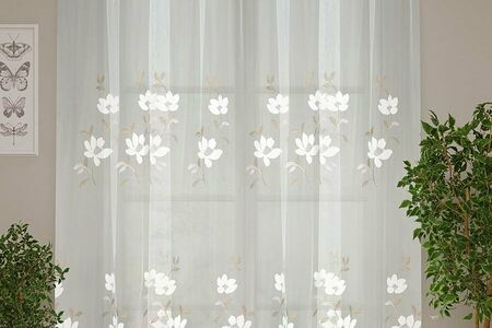 Штора тюлевая из мелкой сетки с вышивкой с виде больших цветов с коричневым рисунком размер 300x270 см будет прекрасно смотреться в комплекте с плотными шторами. Крепление шторная лента.