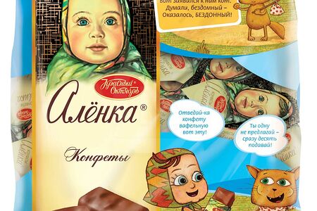 Конфеты Красный Октябрь глазированные шоколадной глазурью с начинкой между слоями вафель "Аленка" 250г, Россия доставка