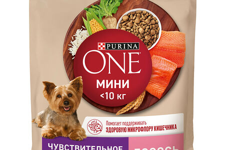 Сухой корм Purina ONE® МИНИ <10 кг Чувствительное пищеварение для собак мелких пород с чувствительным пищеварением, с лососем и рисом, 600 г доставка