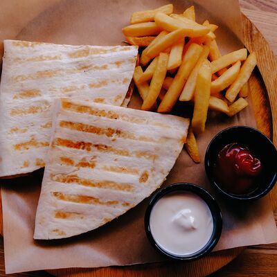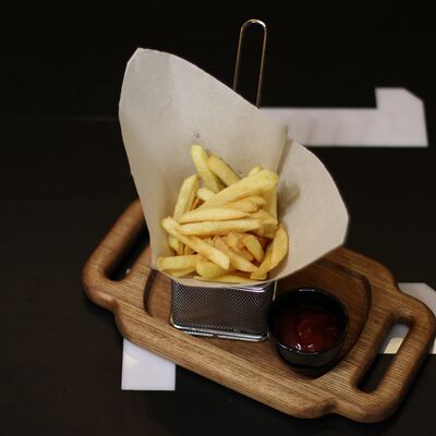 Картофель фри обжаривается во фритюре, подается с кетчупом