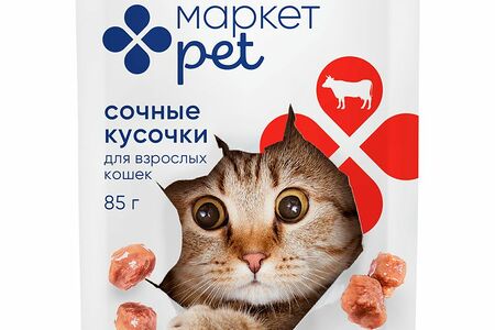 Корм Сочные кусочки в соусе с говядиной для взрослых кошек Маркет Pet, 85г доставка