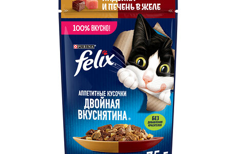 Влажный корм Felix Аппетитные кусочки, Двойная Вкуснятина для взрослых кошек, с индейкой и печенью, в желе 75 г доставка
