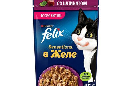 Влажный корм Felix Sensations для взрослых кошек, с уткой в желе со шпинатом 75 г доставка
