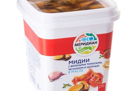 Мидии в масле Меридиан с вялеными томатами, чесноком и зеленью доставка