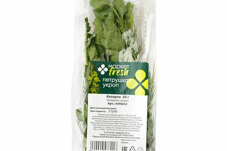 Срок годности в днях: 5Состав: укроп 15гр,петрушка 15грПищевая ценность: Калорийность: 41.5Белки: 3.1Жиры: 0.2Углеводы: 7.2Страна изготовления: РоссияПроизводитель: Маркет