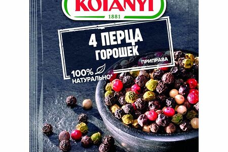 Срок годности в днях: 1440Состав: Перец (черный, белый, зеленый, розовый). Может содержать следы глютеносодержащих злаков, яиц, сои, сельдерея, кунжута, орехов, горчицы, молока (лактоза).Пищевая ценность: Белки: 6Жиры: 9Углеводы: 72Страна изготовления: АвстрияПроизводитель: Kotanyi
