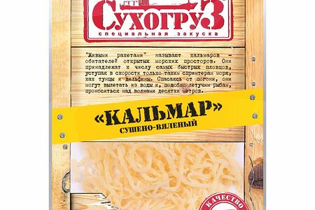 Срок годности в днях: 365Состав: Кальмар (стружка) сушеный, соль, сахар, консервант (сорбиновая кислота), усилитель вкуса и аромата (глутамат натрия).Пищевая ценность: Калорийность: 190Белки: 45Жиры: 0.3Углеводы: 2Страна изготовления: РоссияПроизводитель: Сухогруз