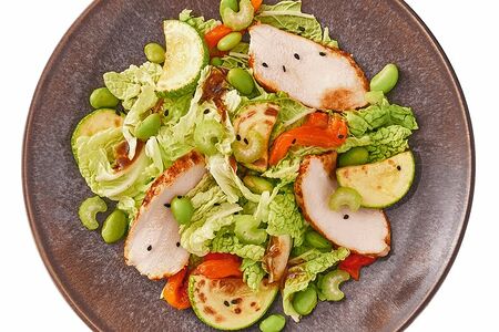 Срок годности в днях: 5Состав: Салат – филе грудки индейки су-вид (содержит соевый соус (сою, глютен)), кабачки, перец сладкий, бобы эдамаме, капуста пекинская, стебель сельдерея, кунжут, масло подсолнечное, соль, чеснок, паприка; соус - масло подсолнечное, соус соевый (содержит сою, глютен), вода питьевая, имбирь, уксус рисовый, уксус 9%, сахар, чеснок.Пищевая ценность: Калорийность: 83.8Белки: 7.7Жиры: 3.8Углеводы: 5.7Страна изготовления: РоссияПроизводитель: Шеф Перекресток