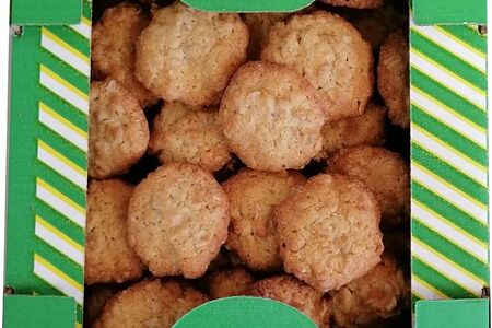 Срок годности в днях: 90Состав: Сахар, мука пшеничная высшего сорта, хлопья овсяные, маргарин (рафинированные дезодорированные растительные масла в натуральном и отвержденном виде, вода, соль, эмульгаторы: моно - и диглицериды жирных кислот, лецитин, ароматизатор «Сливки», регулятор кислотности лимонная кислота, краситель аннато-куркумин), семена подсолнечника, продукты яичные, масло растительное, вода питьевая,эмульгатор (вода, эмульгаторы моно- и диглицериды жирных кислот Е471, эфиры полиглицерина и жирных кислот Е475, эфиры пропиленгликоля и жирных кислот Е477, твин 80 Е433, влагоудерживающие агенты сорбитовый сироп Е420ii, пропиленгликоль Е1520, консервант сорбат калия Е202), разрыхлитель(дигидропирофосфат натрия,гидрокарбонат натрия,мука пшеничная), ароматизатор, соль поваренная пищевая.Пищевая ценность: Калорийность: 440Белки: 6Жиры: 21Углеводы: 55Страна изготовления: РоссияПроизводитель: Король Сладостей