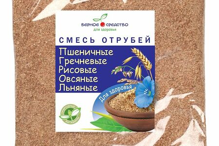 Срок годности в днях: 365Состав: Отруби пшеничные, отруби рисовые, рисовая мука, отруби овсяные, оболочка гречихи, отруби льняные.Пищевая ценность: Белки: 15Жиры: 4.5Углеводы: 15Страна изготовления: РоссияПроизводитель: Верное средство