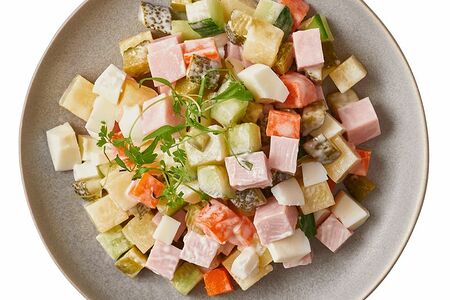 Срок годности в днях: 5Состав: картофель, огурцы маринованные [огурцы, сахар, соль, регулятор кислотности уксусная кислота, пряности], ветчина [филе индейки, филе курицы, свинина, крахмал картофельный, соевый белок, шкура свиная, стабилизатор Е407, загустители: ксантановая камедь, конжаковая камедь, регуляторы кислотности: Е451, Е262, Е331, антиокислитель Е316, желирующий агент Е508, мальтодекстрин, декстроза, усилитель вкуса и аромата Е621, ароматизатор, гемоглобин, чеснок, краситель кармины, фиксатор окраски Е250], яйцо куриное маринованное [яйцо куриное, маринад: регулятор кислотности Е260, соль], майонез [масло подсолнечное, сахар, яичный желток, соль, уксус, горчичное масло, краситель каротины], огурцы свежие, морковь, соль.Пищевая ценность: Калорийность: 152Белки: 5.4Жиры: 11.9Углеводы: 6Страна изготовления: РоссияПроизводитель: Шеф Перекресток