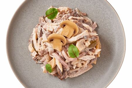Срок годности в днях: 4Состав: Огурцы маринованные [содержит семена горчицы], язык говяжий, майонез [содержит яичный желток и горчичное масло], ветчина [содержит соевый белок, ароматизатор], лук репчатый, шампиньоны консервированные ,филе грудки куриное, масло подсолнечное, зелень петрушки, соль, чеснок.Пищевая ценность: Калорийность: 193Белки: 8.2Жиры: 16.5Углеводы: 2.9Страна изготовления: РоссияПроизводитель: Шеф Перекресток