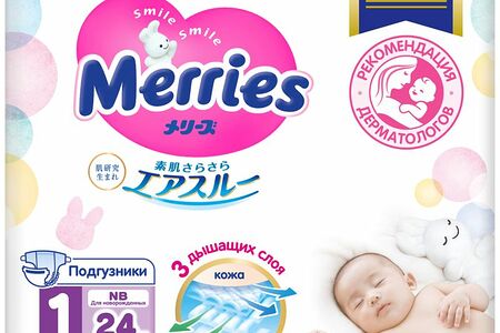 Подгузники Merries для новорожденных р.NB до 5кг, 24шт доставка