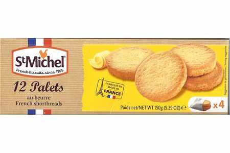 Срок годности в днях: 273Состав: мука ПШЕНИЧНАЯ, масло СЛИВОЧНОЕ (31%), сахар, ЯЙЦО куриное (4,9%), соль, ароматизатор, комплексная пищевая добавка: пекарский порошок (разрыхлитель: карбонаты аммония, карбонаты натрия, регулятор кислотности: лимонная кислота). Продукт содержит: ПШЕНИЦА, МОЛОКО, ЯЙЦО. Продукт может содержать следы: СОЯ, КУНЖУТ, ОРЕХИПищевая ценность: Калорийность: 513Белки: 6Жиры: 27Углеводы: 61Страна изготовления: ФранцияПроизводитель: St Michel