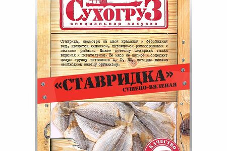 Срок годности в днях: 365Состав: Ставрида (пласт) сушеная, соль, консервант (сорбиновая кислота).Пищевая ценность: Калорийность: 220Белки: 50Жиры: 2.5Страна изготовления: РоссияПроизводитель: Сухогруз