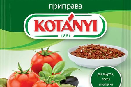 Срок годности в днях: 540Состав: (56,5%) томатные хлопья (томатная паста (томаты, агент антислеживающий Е551), кукурузный крахмал), соль йодированная (соль, калия йодид), оливки, базилик, лук, орегано, чеснок, сахар, шалфей.Пищевая ценность: Калорийность: 269Белки: 11Жиры: 6.6Углеводы: 35Страна изготовления: АвстрияПроизводитель: Kotanyi